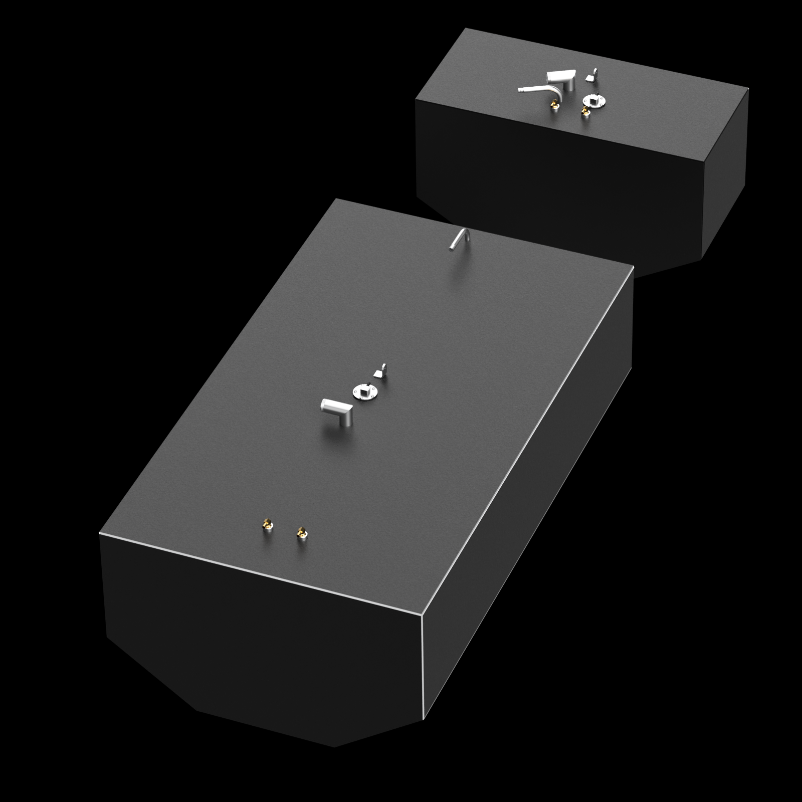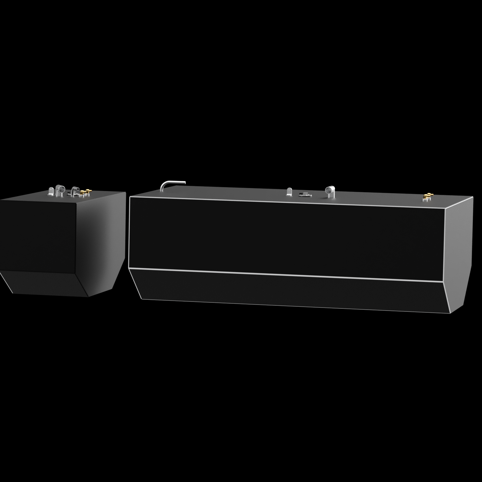Two dark gray, rectangular fuel tanks, of different sizes, are shown against a black background. Both tanks have various metallic fittings on their top surfaces, and a thin white outline along their top edges