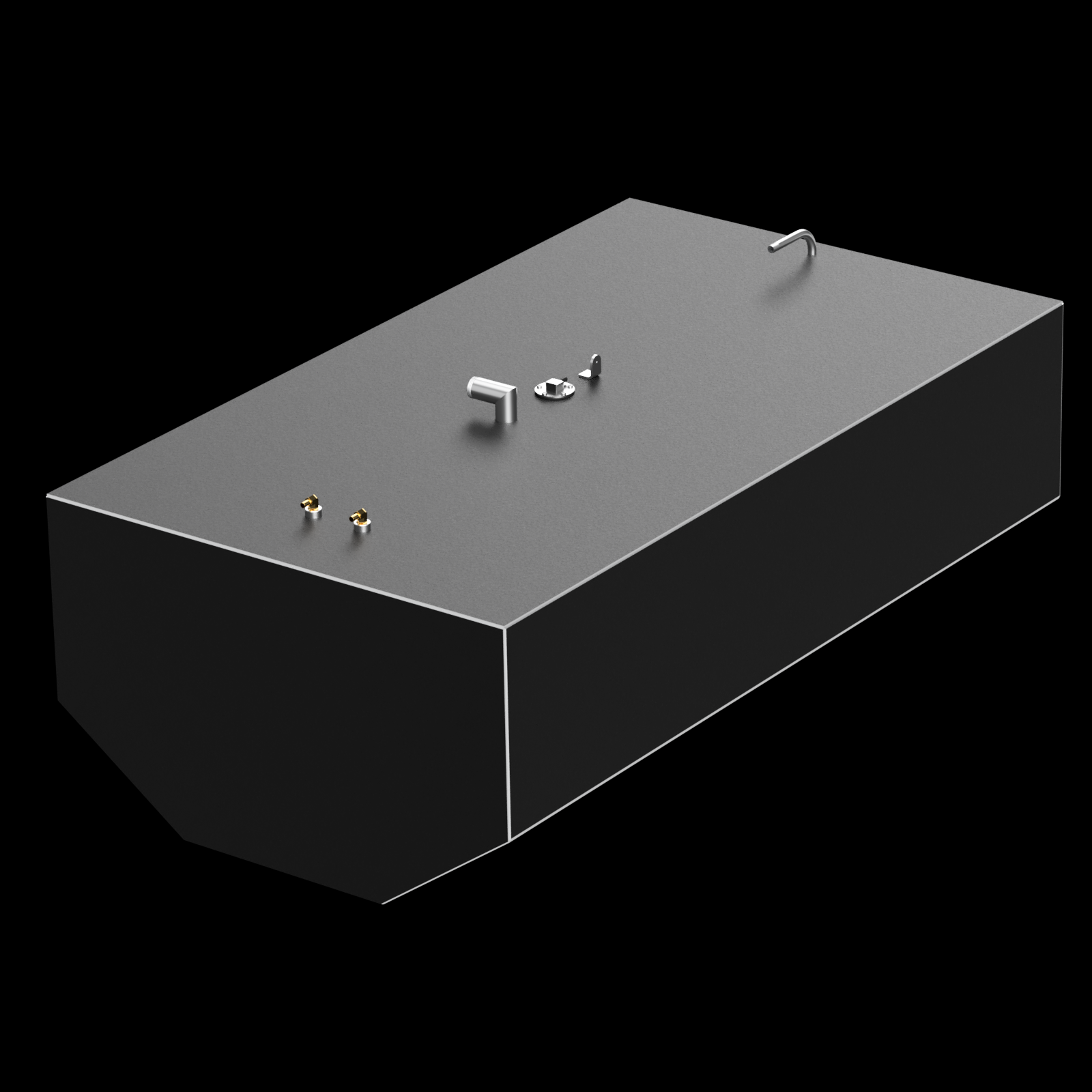 A dark gray, rectangular fuel tank is shown at an angle against a black background. The tank has a thin white outline along its top edges, and various metallic fittings on its top surface, including two small brass-colored ones and a larger silver-colored set
