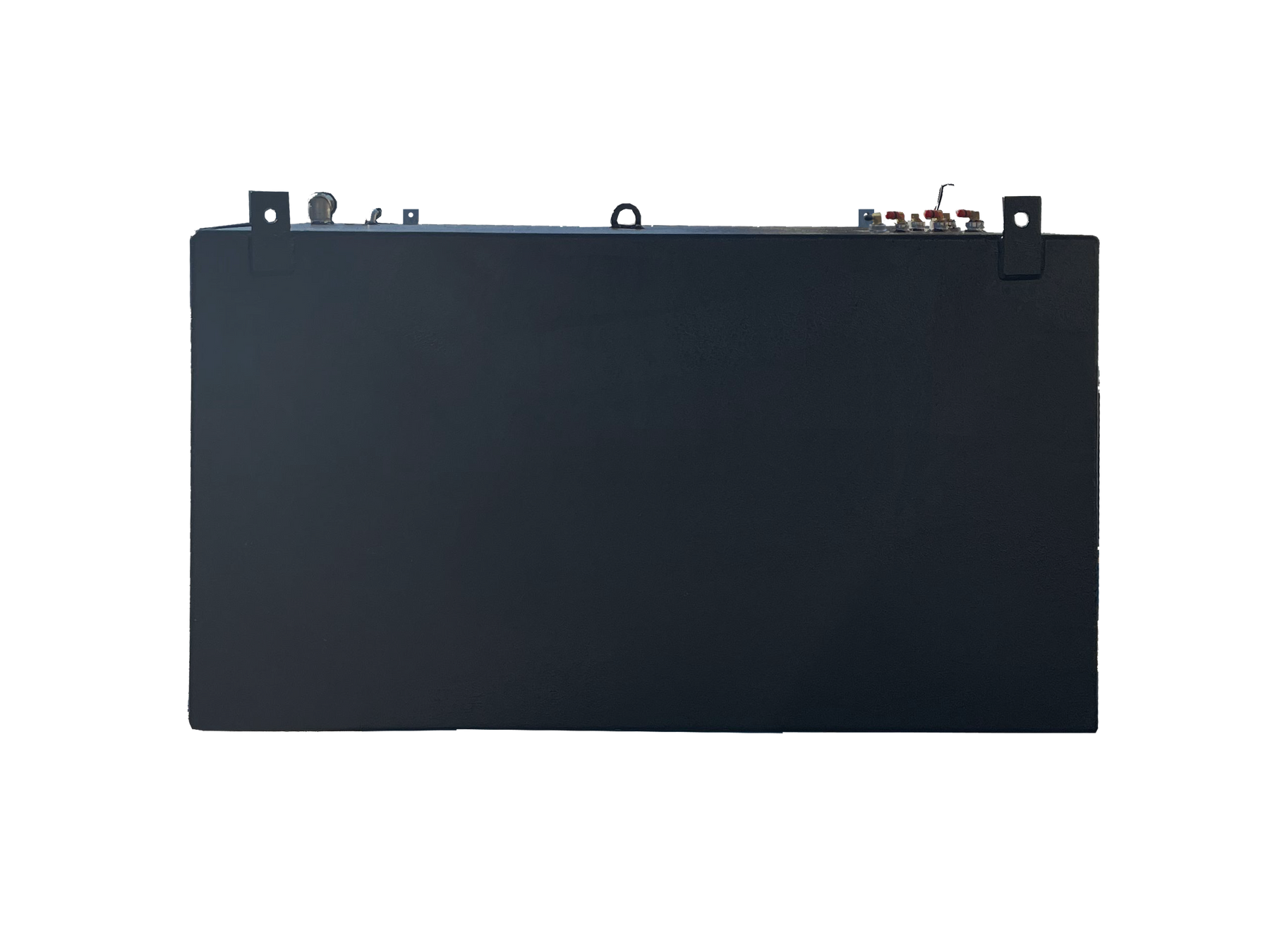 A profile photo showing the short end of a large, dark grey, rectangular boat fuel tank. Various fittings and two mounting tabs are visible along the top edge, against a transparent checkerboard background.