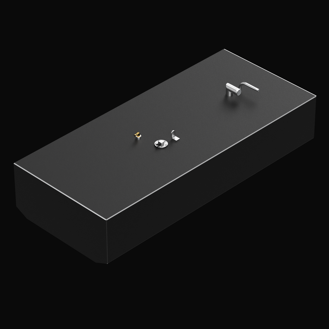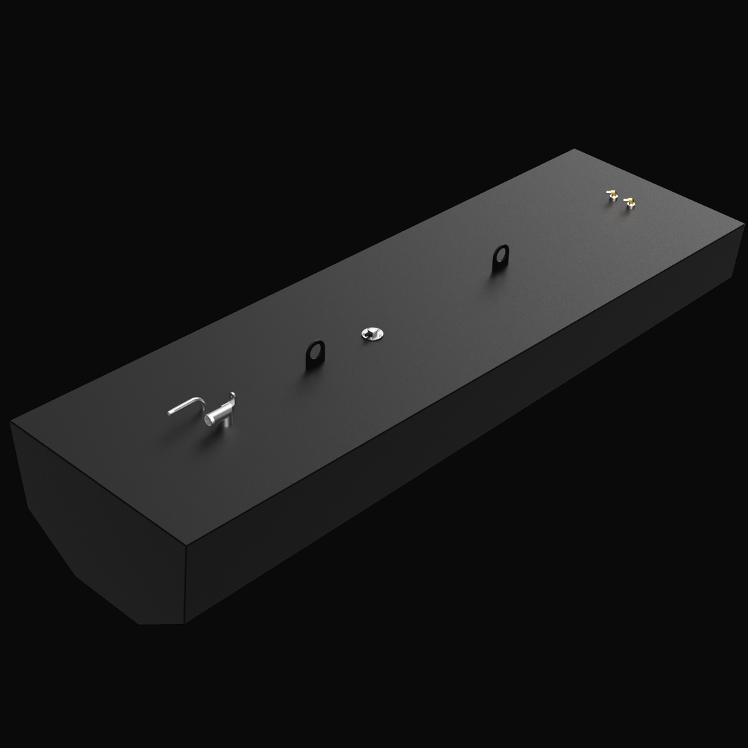 An aerial view of four black OEM replacement fuel tanks floating on the ocean, surrounded by turquoise water with white foam.