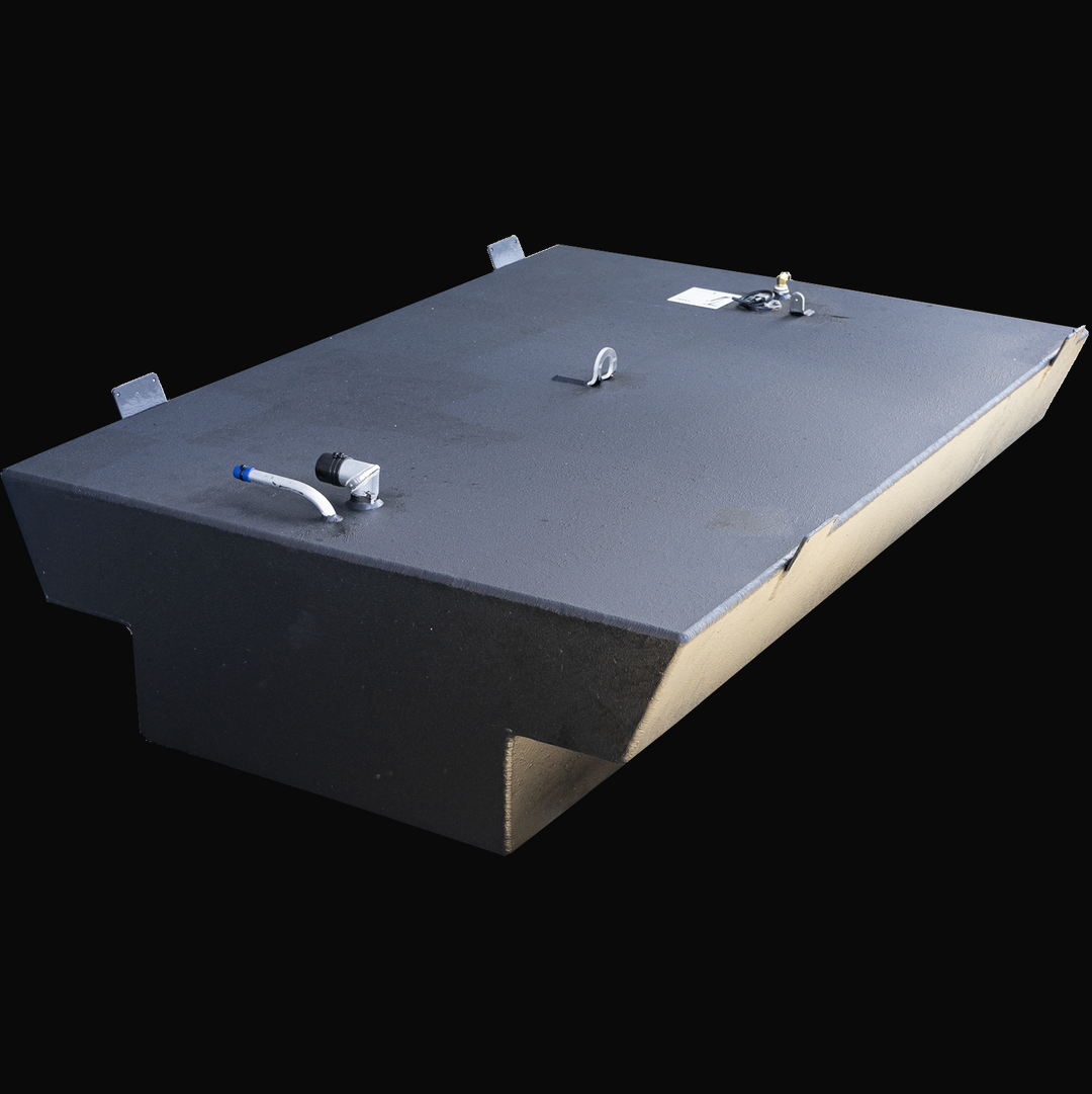 An aerial view of four black OEM replacement fuel tanks floating on the ocean, surrounded by turquoise water with white foam.