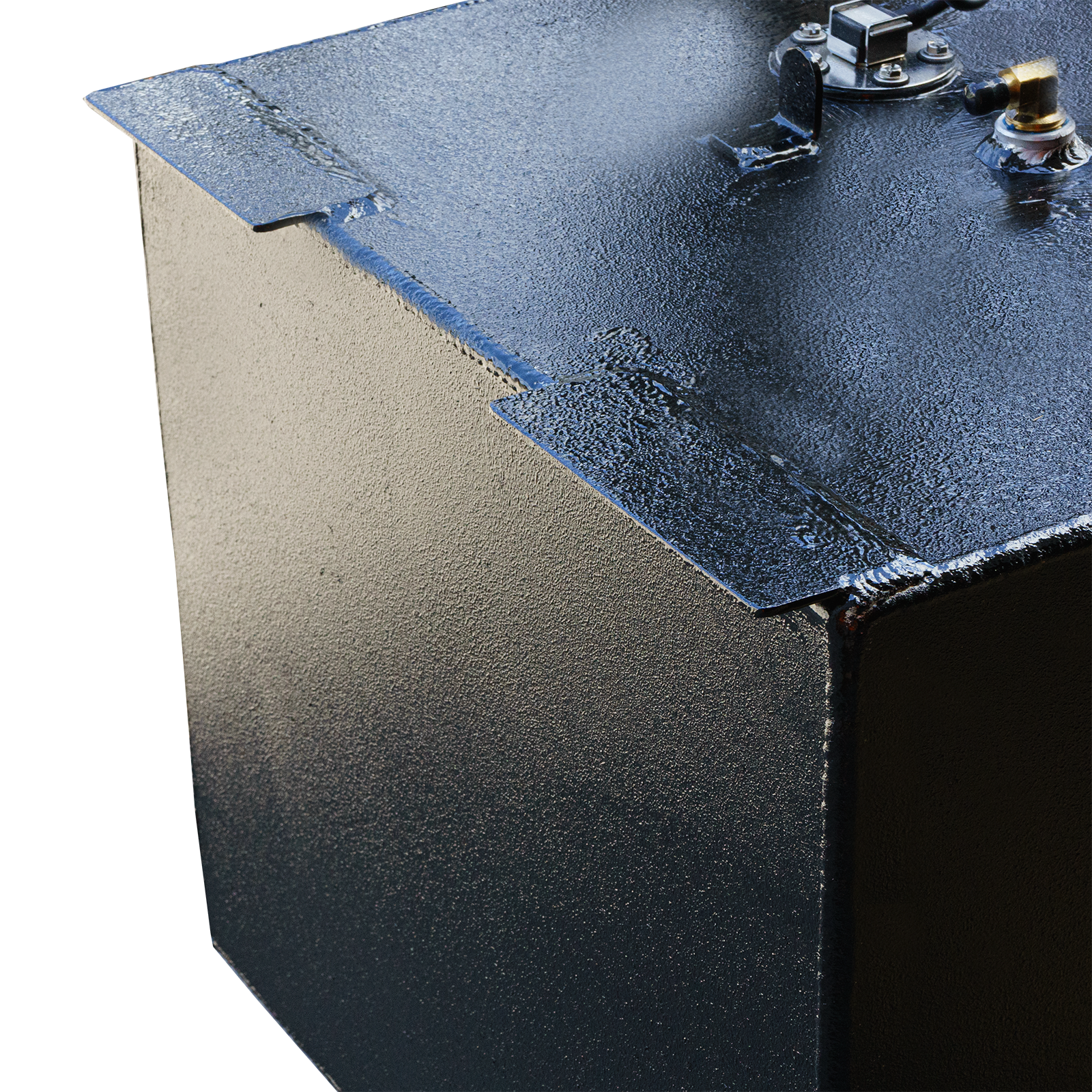 OEM replacement belly fuel tank for Mako 21' boat, featuring a sleek black design and a capacity of 125 gallons, with multiple fittings on top