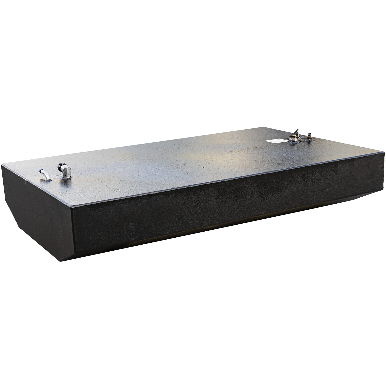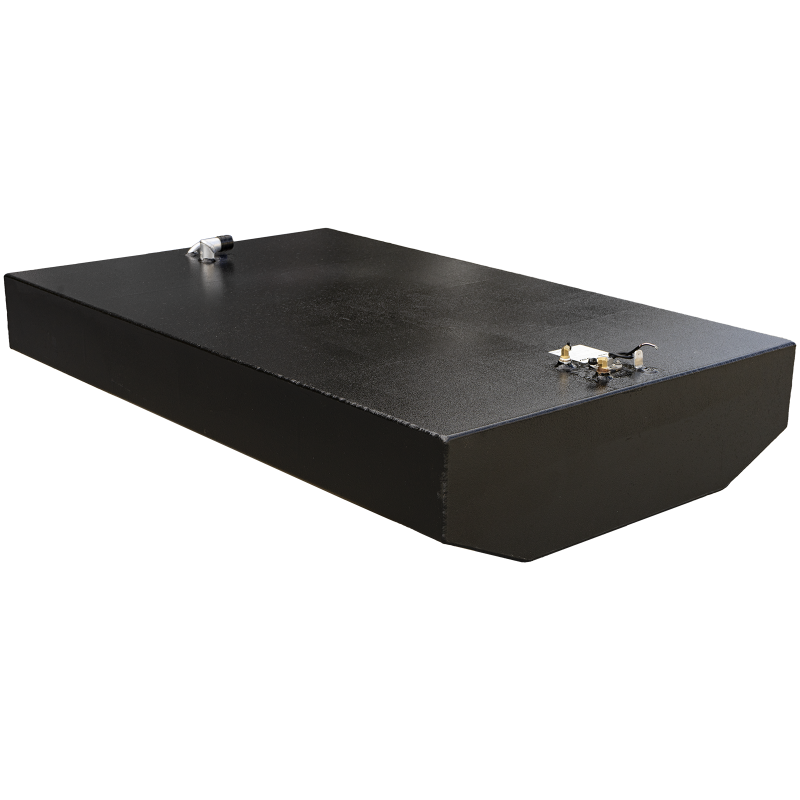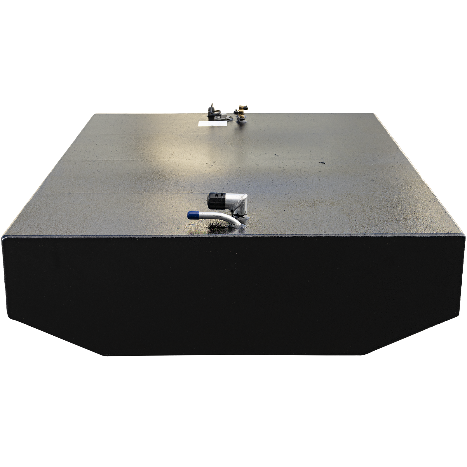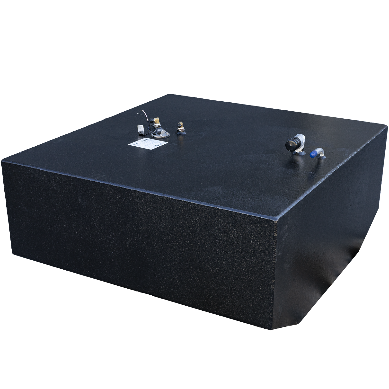 119-gallon gross capacity aluminum fuel tank built for the 2001 Grady-White 265 Express, serving as the aft unit in the tandem OEM replacement combo kit. Tank dimensions are 41″ (L) × 39″ (W) × 18″ (H), shown with top-mounted hardware for fuel delivery, return, and sender integration. Flat surface and marked ports enable straightforward installation, while visual consistency with the forward tank ensures balanced cavity alignment and compliant system upgrade