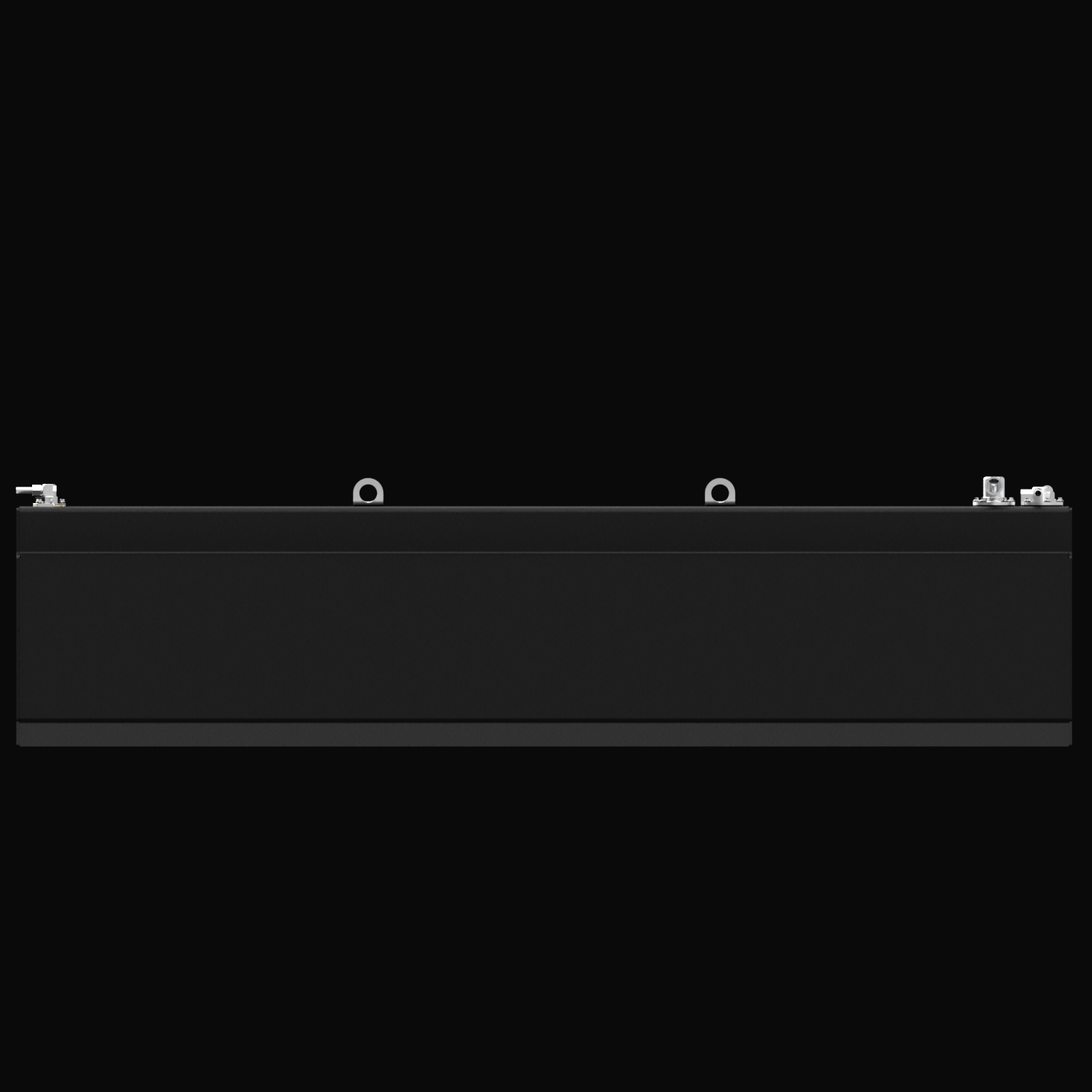 "A 3D rendering of a black, 271-gallon marine fuel tank for a Nor-tech 340 boat. The rectangular tank features a stepped design and is equipped with silver-colored hardware on the top surface, including four vent/return fittings, two fill ports, fuel level senders, and two lifting lugs."