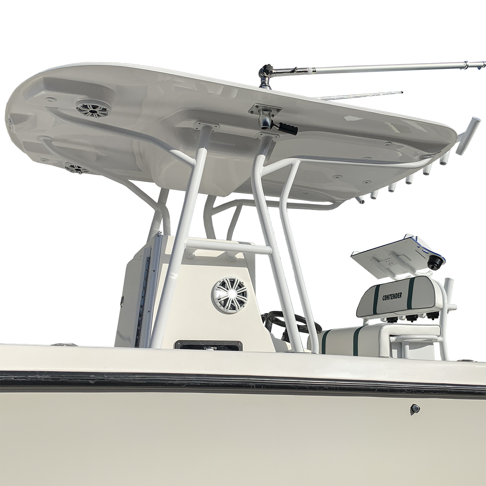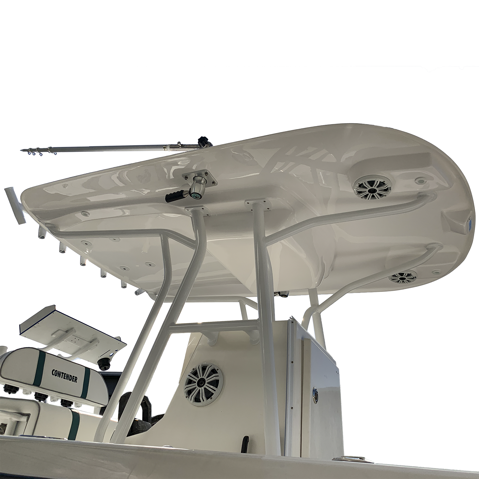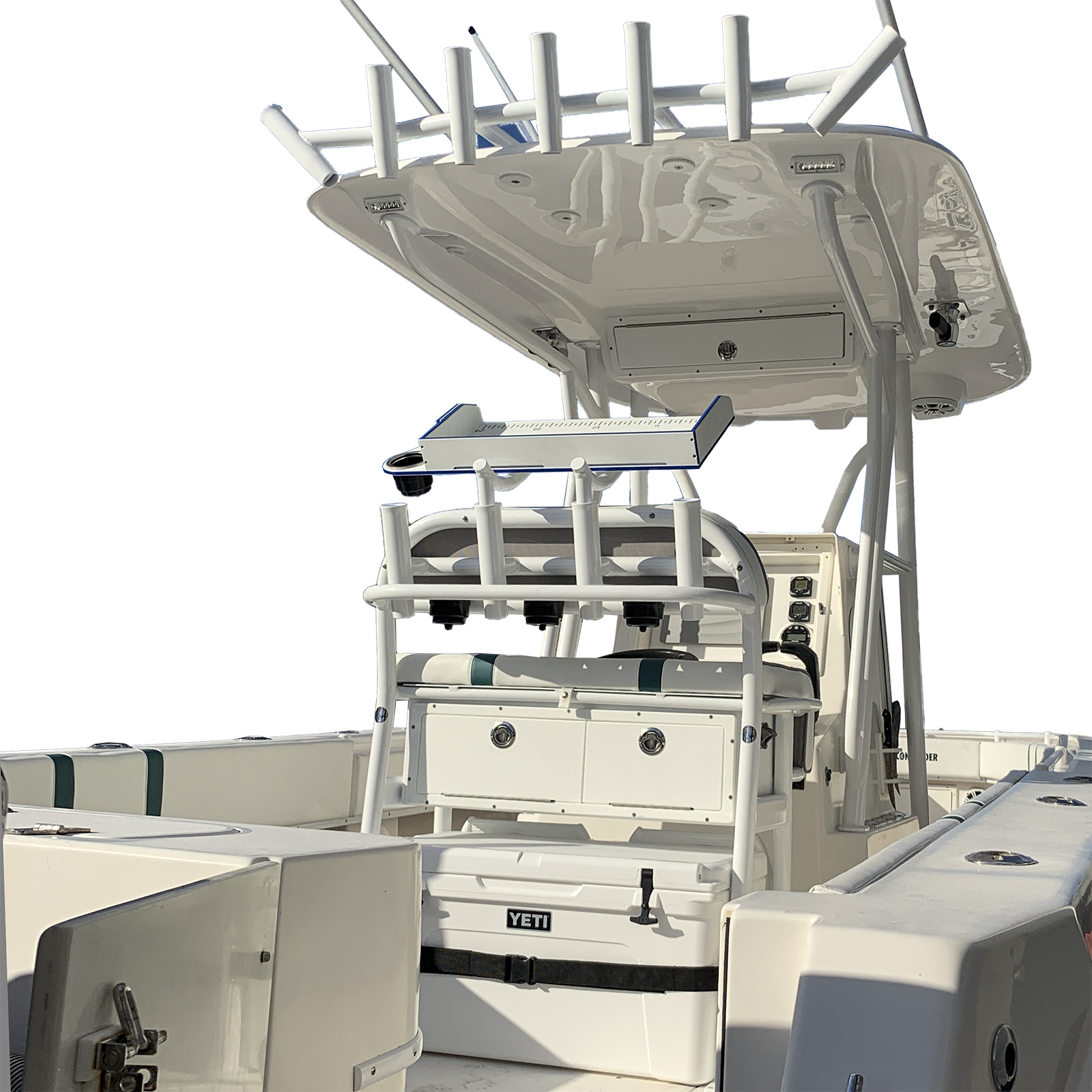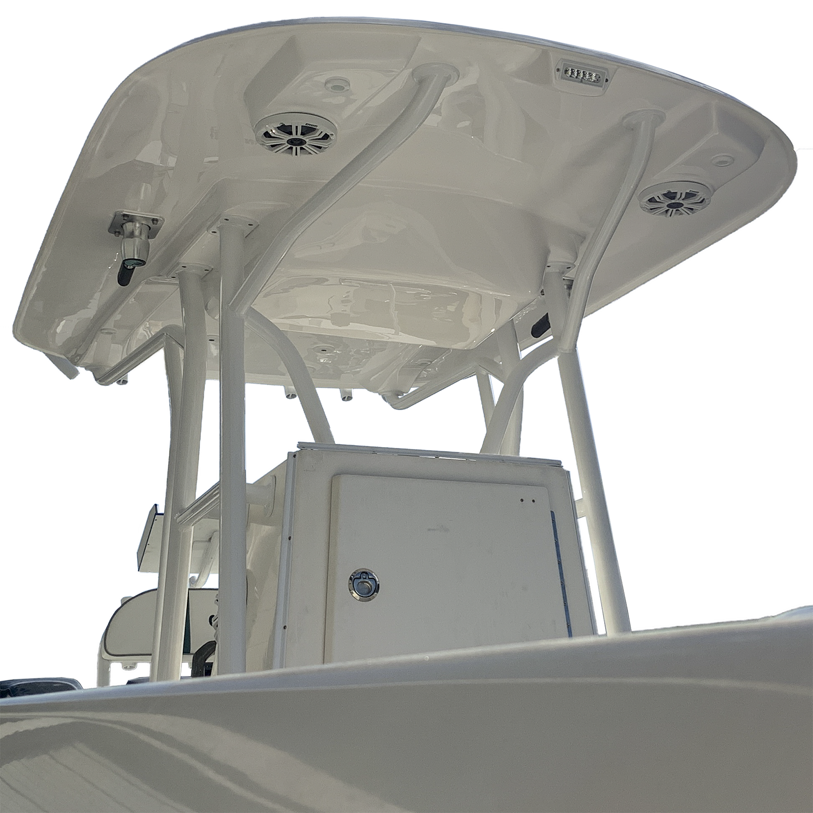 It features one center LED port, two rear-facing plus two down-facing LED ports at the help position. We sell it with and optional LED lights kit from our exclusive marine lighting partner, Lumitec, to complement one of the best looking and more functional hard tops available for the 20 to 25-foot sport fisherman class.
